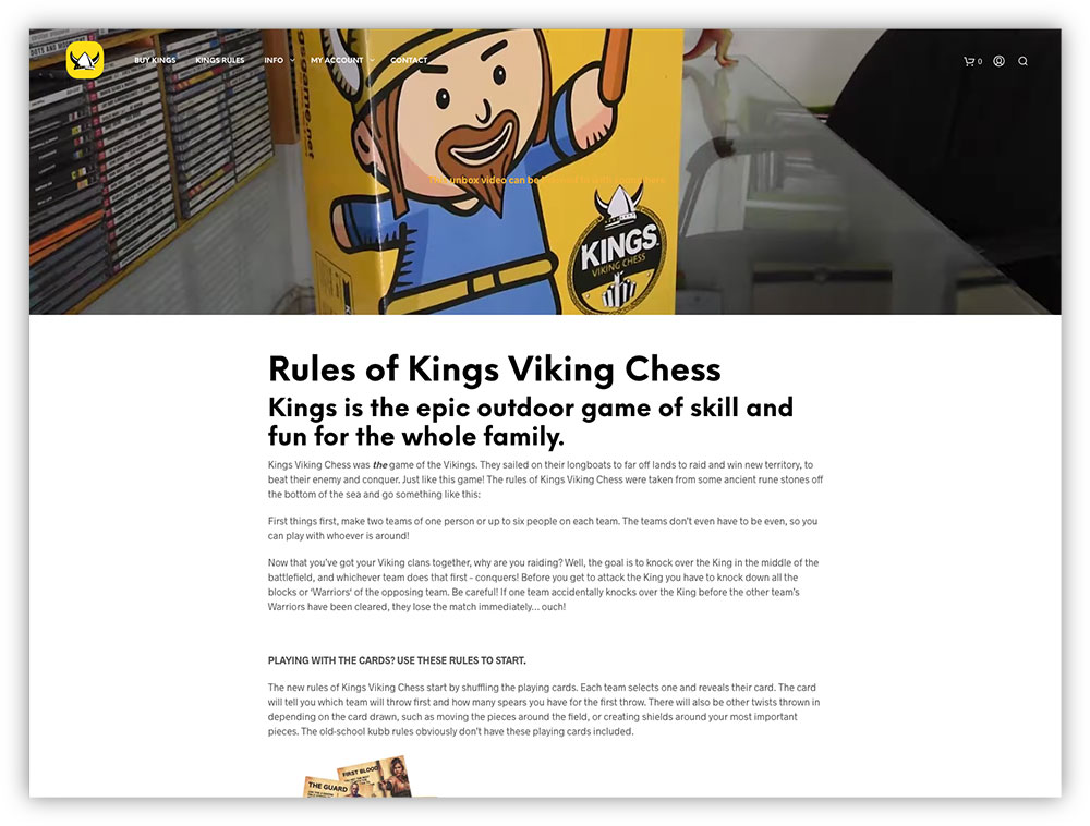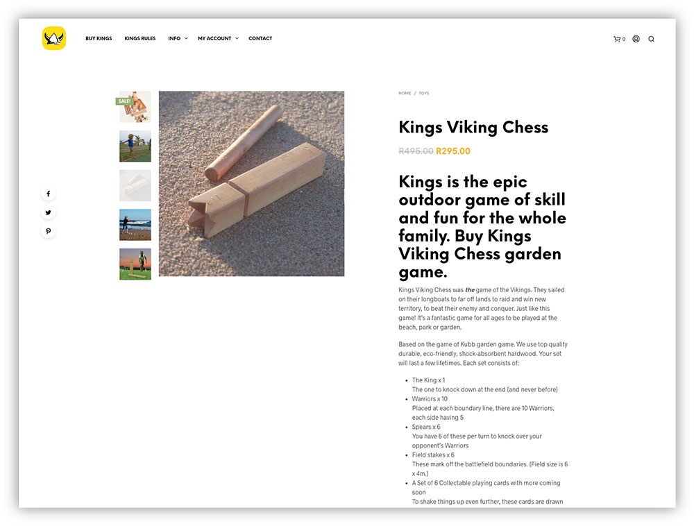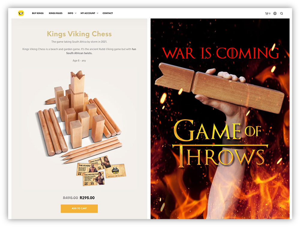 Kings Game is a Viking themed e-commerce website which sells Kings Viking Chess and is based off of the Kubb Swedish outdoor lawn game. Payments are facilitated by PayFast and deliveries are either via local collection or PostNet. |